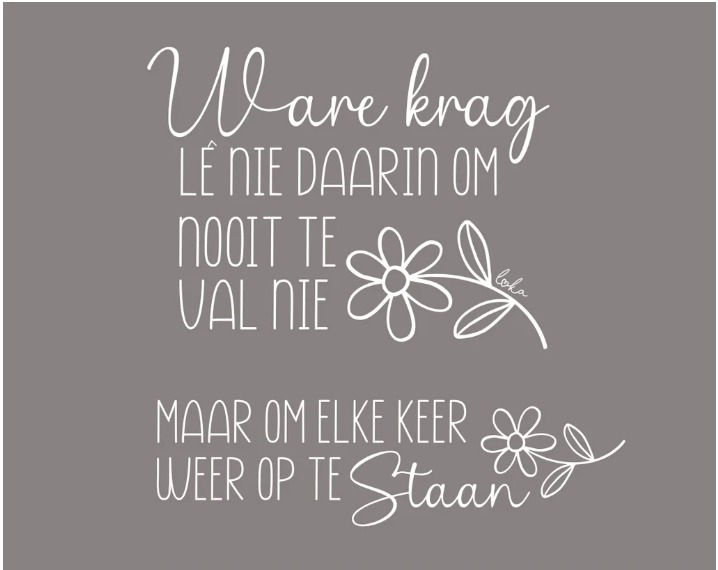 | Product Quotes | Elke dag is 'n nuwe begin – haal diep asemn en probeer weer, Loka Est 2016, My Story is Built on Grace my future lives in hope, Ware krag lê nie daarin om nooit te val nie maar om elke keer weer op te staan |